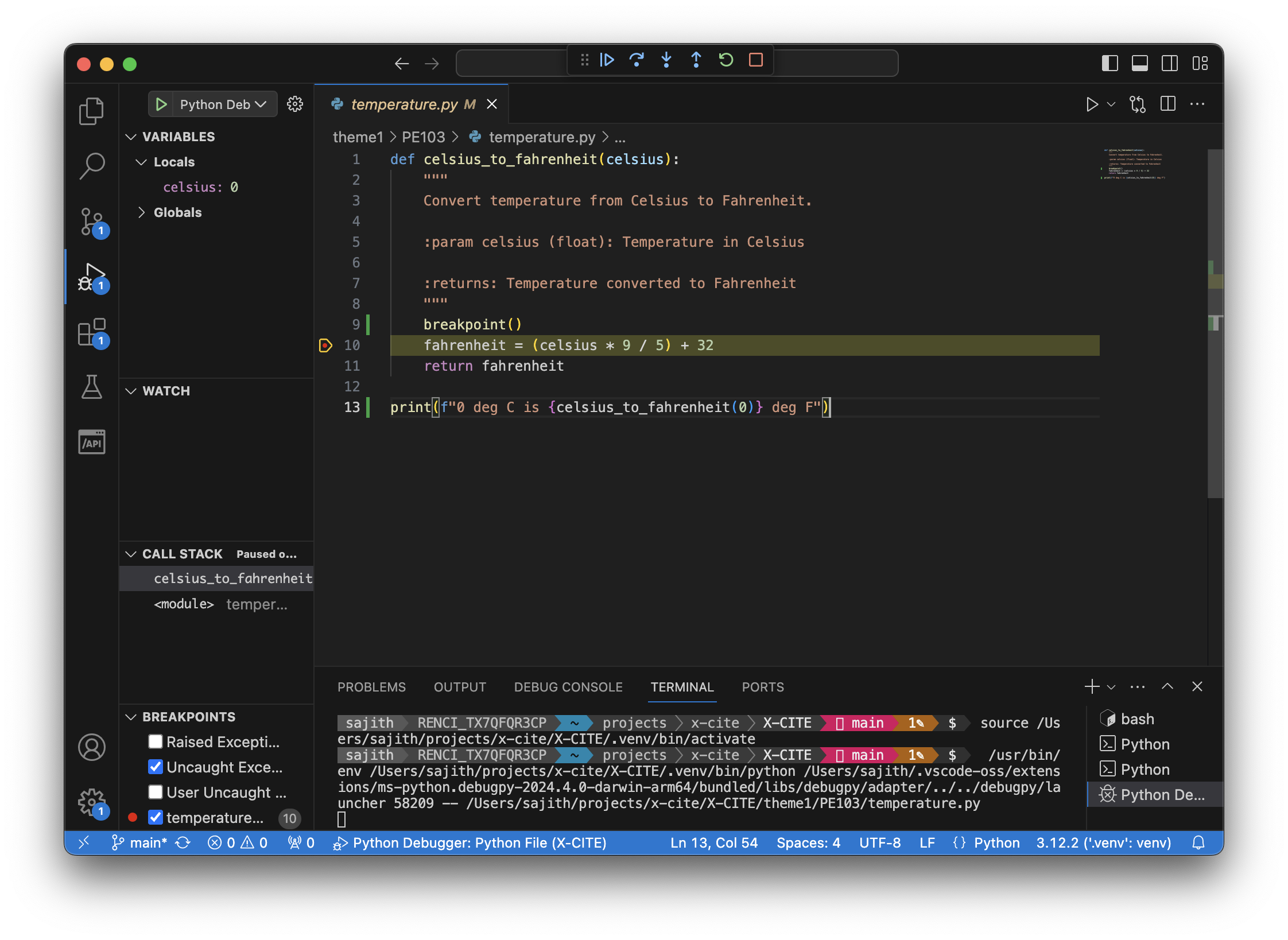 print(f"0 deg C in fahrenheit: {celsius_to_fahrenheit(0)}")Now you can run the program with python3 -m temperature.py. Once the execution reaches the line with breakpoint(), you will be dropped into the pdb shell.