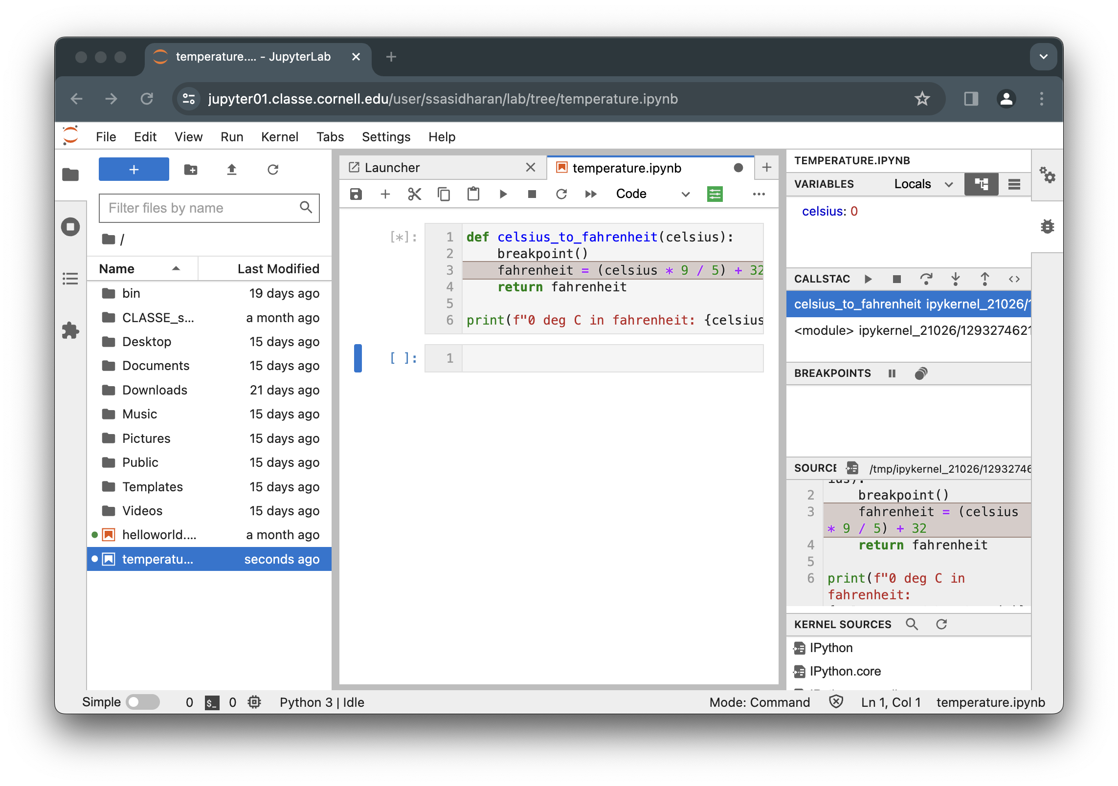 print(f"0 deg C in fahrenheit: {celsius_to_fahrenheit(0)}")Now you can run the code with python3 temperature-pdb.py, and use various pdb commands.